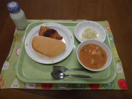 今日の献立)セルフフィッシュサンド・牛乳・トマトシチュー・キャベツサラダ