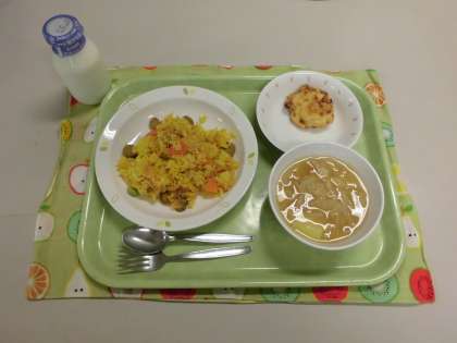 今日の献立)カレピラフ・牛乳・キャベツスープ・大豆とコーンのフリッター
