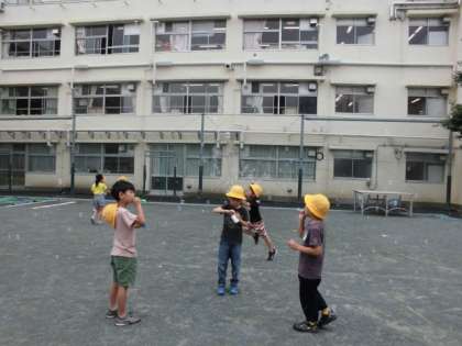 しゃぼん玉に映る自分を見たり、屋根まで飛ばしたり、とてもなかよく楽しく学習することができました。