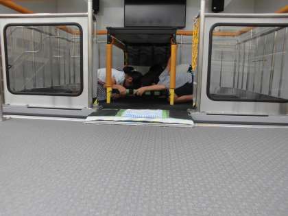 今回4年生は、起震車に乗り、震度7の揺れを体験しました。
