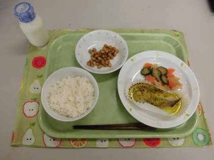 今日の献立)ごはん・牛乳・魚のカレーマヨネーズ焼き・シャキシャキ野菜・ぶどう豆