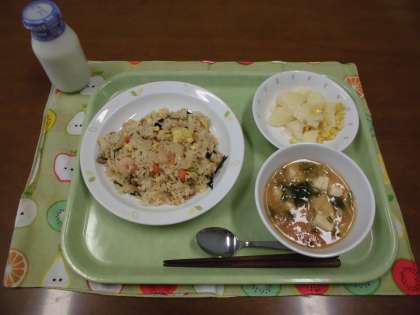 今日の献立)えびと青菜のチャーハン・牛乳・マーボー汁・コーンポテト