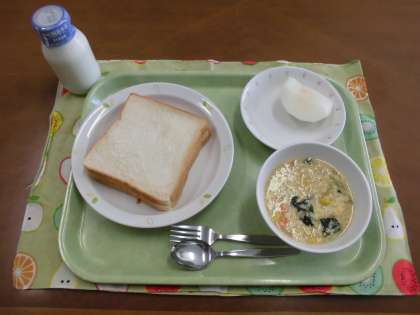 今日の献立)ドライカレーサンド・牛乳・チーズのふわふわスープ・果物(梨)です。