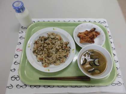 今日の献立)ひじきごはん・牛乳・とり肉の南蛮揚げ・みそ汁