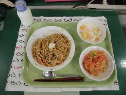 今日の献立)五目焼きそば・牛乳・もやしのコチュジャンかけ・フルーツヨーグルト