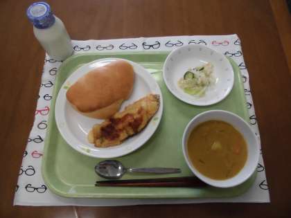 今日の献立)ショートニングパン・牛乳・魚のフライ・野菜のひとしお・カレーシチュー