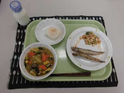今日の献立)カレーうどん・牛乳・・ししゃもの香味揚げ・豆サラダ・果物(梨)