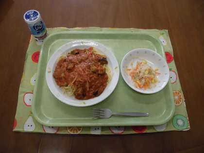 今日の献立)スパゲティーなす入りミートソース・ジョア・コーンサラダ
