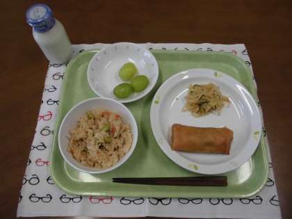 今日の献立)手作りなめたけごはん・牛乳・白菜の中華サラダ・春巻き・果物(シャインマスカット)