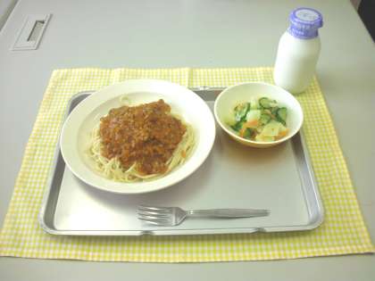 今日の献立は、ミートソーススパゲティ、じゃがいもサラダ、牛乳です。