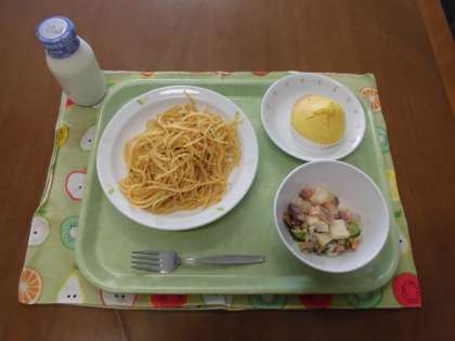 今日の献立)スパゲティーボンゴレ・牛乳・シーザースサラダ・かぼちゃケーキ