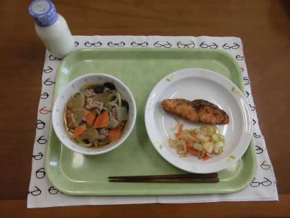 今日の献立)肉汁うどん・牛乳・魚のカリント揚げ・野菜のおかかあえ