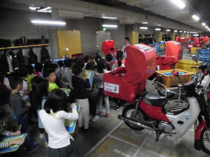 生活科の学習の一環として、世田谷郵便局へ見学に行ってきました。「郵便局に集められた郵便物はどうなるのだろう?」「家に届く郵便物はどのように配達されるのだろう?」など、様々な疑問を胸に郵便局を見学し、お話を聞きました。たくさんの配達車やバイク、住所を読み込んで高速で郵便物を振り分ける機械など、普段は見ることができないものを間近で見学させていただき興奮の連続でした。