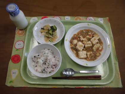 今日の献立)梅わかごはん・牛乳・秋のマーボー豆腐・きゅうりとかぶの中華づけ
