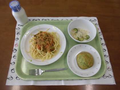 今日の献立)スパゲティーカレーソース・牛乳・キャベツサラダ・つなツナパンケーキ