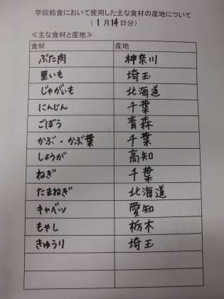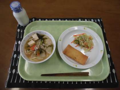 今日の献立)豚汁うどん・牛乳・変わり春巻き・野菜のごま酢あえ