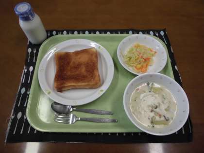 今日の献立)シナモントースト・牛乳・さつまいもシチュー・コーンサラダ