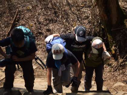 登山途中、あまりの急な斜面に戸惑う子供たち。