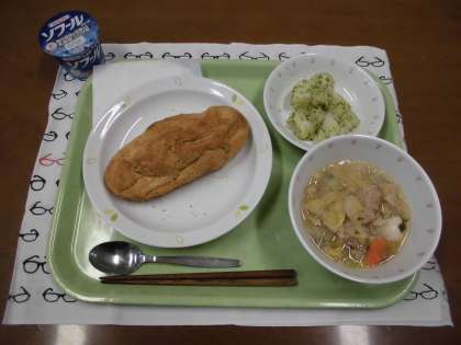 今日の献立)揚げパン(きなこ)・ヨーグルト・肉団子入り春雨スープ・青のりポテト