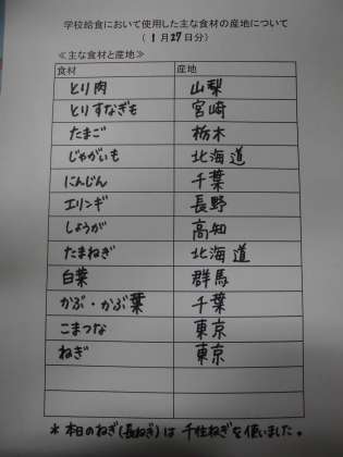 1月24日は学校給食の定番「カレーライス」にしました。2日目の今日は学校給食の定番「揚げパン」「肉団子入り春雨スープ」、そして東京産の食材「千寿ねぎ」です。