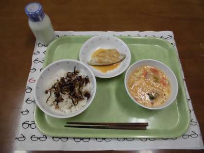 今日の献立)麦ごはん・牛乳・かみかみ佃煮・魚のピリ辛ソース・たまごスープ