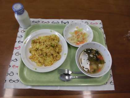 今日の献立)カレーピラフ・牛乳・ABCスープ・キャベツサラダ