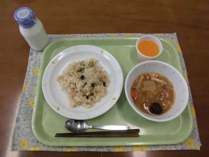 今日の献立)まめまめおこわ・牛乳・揚げつみれ入りみそ汁・キャロットゼリー