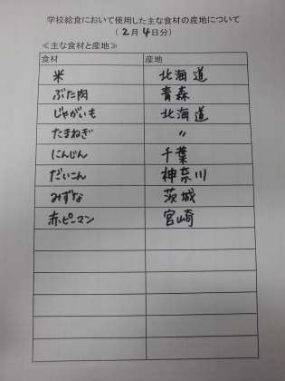 厳しい寒さは立春まで、これからは春の兆しが表れ始めるといわれていますが、そうはいっても2月、まだまだ寒さは続きます。寒さに負けない元気な体を作るためにも、手洗いうがいをおこない、今日もよくかんで、しっかり食べて、食事に感謝して、後片付けまでていねいにおこなってください。