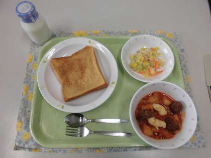 今日の献立)フレンチトースト・牛乳・いかとミートボールのトマト煮・コーンサラダ