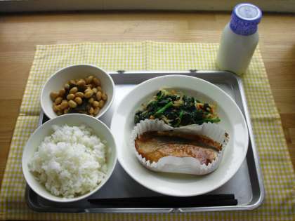 今日の献立は、ごはん、魚のみそマヨネーズ焼き、野菜のごまだれかけ、