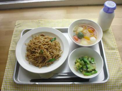 今日の献立は、塩焼きそば、白菜中華あえ、三色白玉フルーツポンチ、