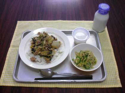 今日の献立は、キムチ丼、野菜の中華風味、ホワイトゼリー、
