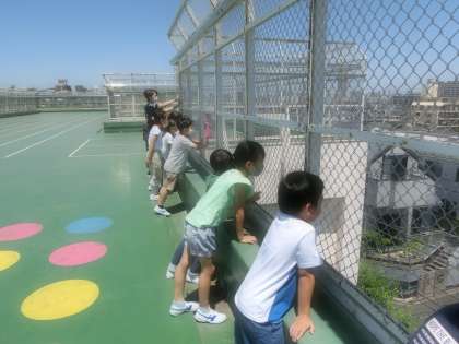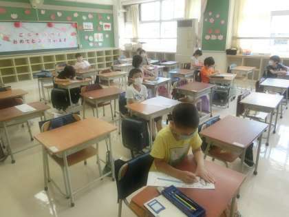 今週の分散登校では、はじめての名前を書いたり、学校の中を探検したりしました。天気がよかったので、屋上に出て中丸小学校の周りの景色を見たり、体を動かしたりして楽しく過ごしました。来週の分散登校は、3日間です。少しずつ学校生活に慣れ、自分でできることも増やしていけるようになるといいですね。