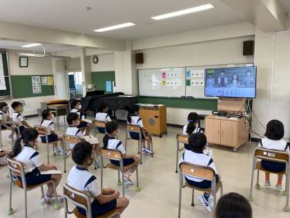 音楽は、初めて教室を移動して音楽室で学習しました。「リズムでなかよくしよう」では、歌に合わせて、歌詞を手話で表現する形で学習しました。