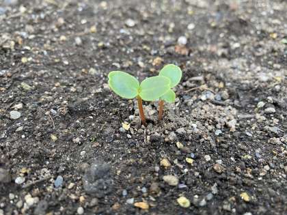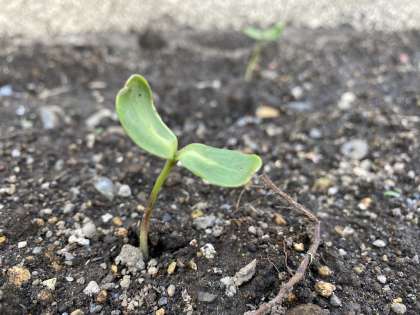 保健室の前に3年生の学年花壇があります。そこに植物の種を2種類まきました。ある日、様子を見に行ってみると・・・芽が出て、ぐんぐんと成長していました。さて、この植物は、何でしょうか。理科の学習「植物を育てよう」を参考にしてください。わかったら、先生たちに教えてくださいね。