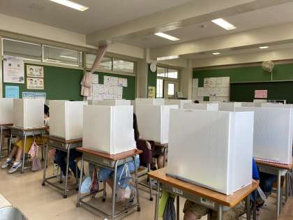 通常登校に伴って、給食が始まりました。安全に給食を食べるために、手洗い・アルコールによる消毒を行い、机には、パーティションを立てて食べています。1日も早くお互いの顔を見ながら楽しい給食の時間に戻る日を願っています。
