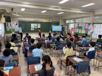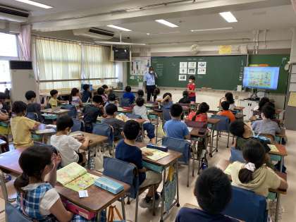 本日の外国語活動では、あいさつの仕方についてジェスチャーやミニゲームを通して、交流をしました。「元気」や「お腹が空いた」などを英語で友達と伝え合う活動を行いました。