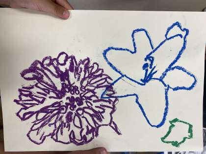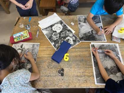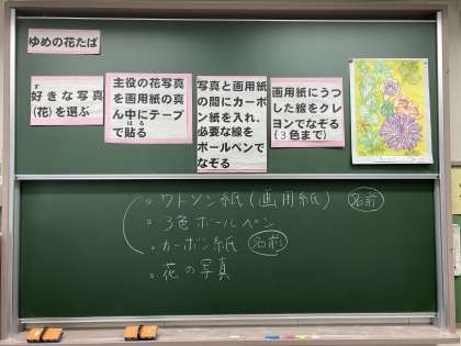 図工の学習で、好きな花の写真を選び、カーボン紙を使って、形をかく学習をしています。この後は、クレヨンで線を太くして表現豊かな絵になるように色を塗っていく予定です。完成までが楽しみです♪
