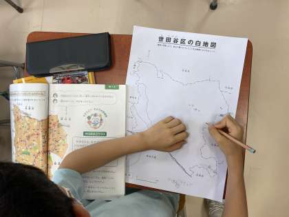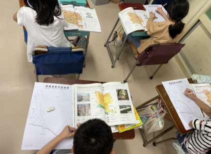 世田谷区の白地図に、世田谷区の様子(土地の使われ方、交通など)を教科書を使って、まとめる学習をしています。子どもたちは皆、地図記号や色分けなど工夫をしながら活動しています。
