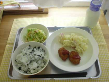 今日の献立は、わかめごはん、豆腐のナゲット、じゃがいものクリーム煮、