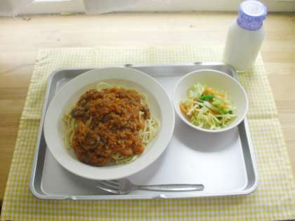 今日の献立は、ミートソーススパゲティ、じゃがいものハニーサラダ、