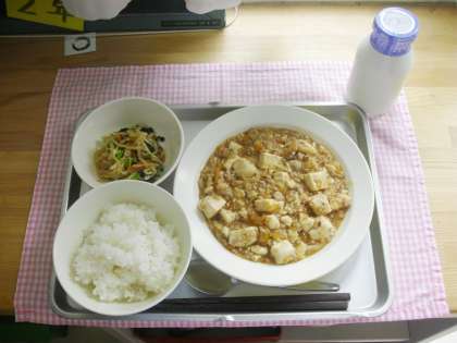 今日の献立は、ごはん、麻婆豆腐、ナムル、牛乳です。