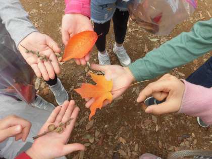 公園では、初めに秋見つけをしました。子どもたちは、落ち葉やどんぐりをたくさん見つけることができました。