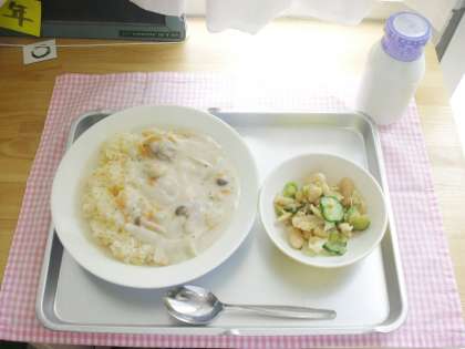 今日の献立は、キャロットライスのクリームソースがけ、豆サラダ、