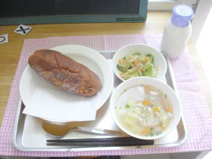 今日の献立は、あげパン、ABCスープ、春雨サラダ、牛乳です。