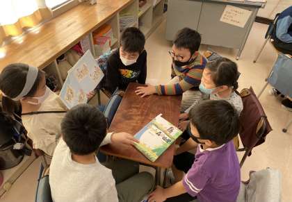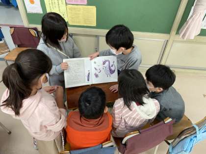 国語「はんで意見をまとめよう」の学習の一環として、各グループで読み聞かせを行いました。どのグループも時間を意識したり、相手が聞き取りやすいように読む早さに緩急をつけたりしていました。初めて読み聞かせを行いましたが、全員が約束を守って活動していました。