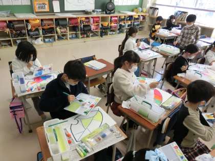 絵の具の使い方の学習で、「カラフルなはっぱをかこう」の学習をしました。今回は、2色の絵の具を混ぜて、色を塗りました。始めに、クレヨンではっぱの線を描いて、その後に、色を塗ります。