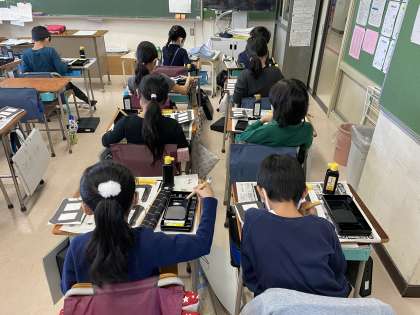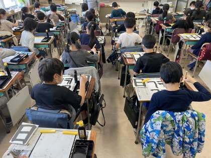 「おれ」に気をつけたり、たて画や横画の太さなども意識させたりして取り組みました。子どもたちは、静かに集中して活動していました。
