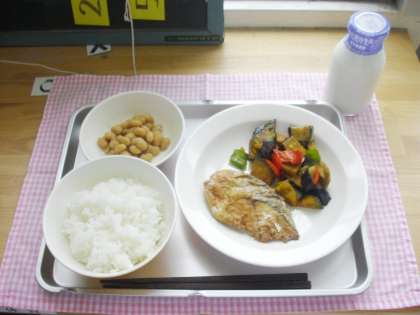 今日の献立は、ごはん、さわらの梅肉焼き、夏野菜の南蛮かけ、ぶどう豆、