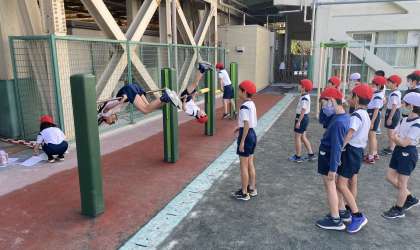 今週から校庭の体育は、3つの運動を始めました。(1時間で、2つの運動を取り入れています。)鉄棒運動では、学習カードを見ながら挑戦したい技を選び取り組んでいます。幅跳びでは、正しいフォームを意識して跳ぶように声かけをしています。短なわは、短なわカードに沿って、活動しています。これからも安全に気をつけながら体育学習を進めていきます!